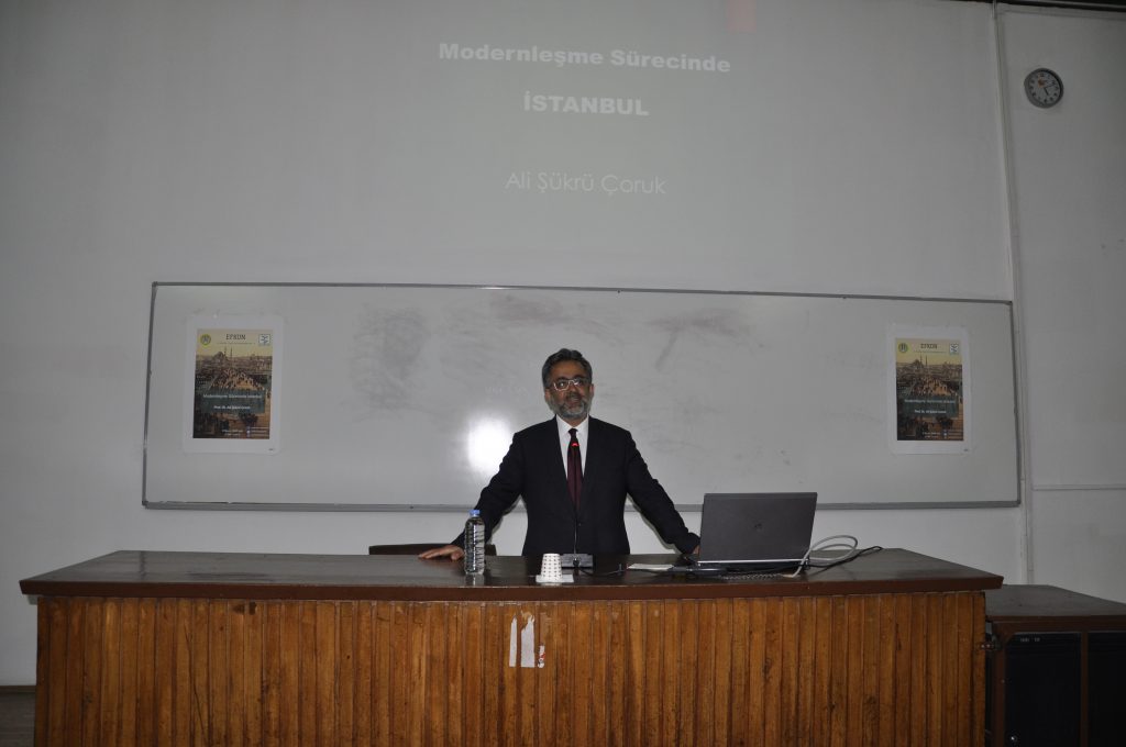 Prof. Dr. Develi’nin açılış konuşmasının ardından kürsüye çıkan Prof. Dr. Ali Şükrü Çoruk, yaptığı sunumla İstanbul’un modernleşme sürecini yüzyıllara göre ele alıp örneklerle anlattı. Modernleşme sürecinin birçok farklı açıdan ele alınabileceğini ancak kendisinin daha çok modernleşmenin İstanbul’daki sosyal yaşama etkileri üzerine yoğunlaşacağını belirten Prof. Dr. Çoruk, “İstanbul’un modernleşme olgusu Fatih Sultan Mehmet dönemine kadar dayandırılabilir. Modernleşme eğilimleri 3. Selim döneminde hareketlenmiştir ancak Tanzimat Dönemi bir başlangıç noktası olarak alınabilir ve bu dönemde hız kazanmıştır” dedi.