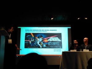 Dr. Öğr. Üyesi Nişancı’nın sunumunun ardındanNişantaşı Üniversitesi Öğretim Görevlisi Döndü Toker, “Sanaldan Gerçekliğe Bir Okuma Denemesi: Star Wars Evreninin Gerçeklikle Etkileşimi” adlı sunumunu gerçekleştirdi. Film serisinden doğan Jedizm dininden bahseden Toker, Star Wars serisinin yazar ve yönetmeni George Lucas’ın “Star Wars serisini yaparak aydınlık tarafın çırağıyken, Anakin Skywalker gibi karanlık tarafa geçmiş oldum” dediğini aktaran Toker, Lucas’ın alternatif filmler yaparken Star Wars ile popüler dünyaya geçişine değindi.