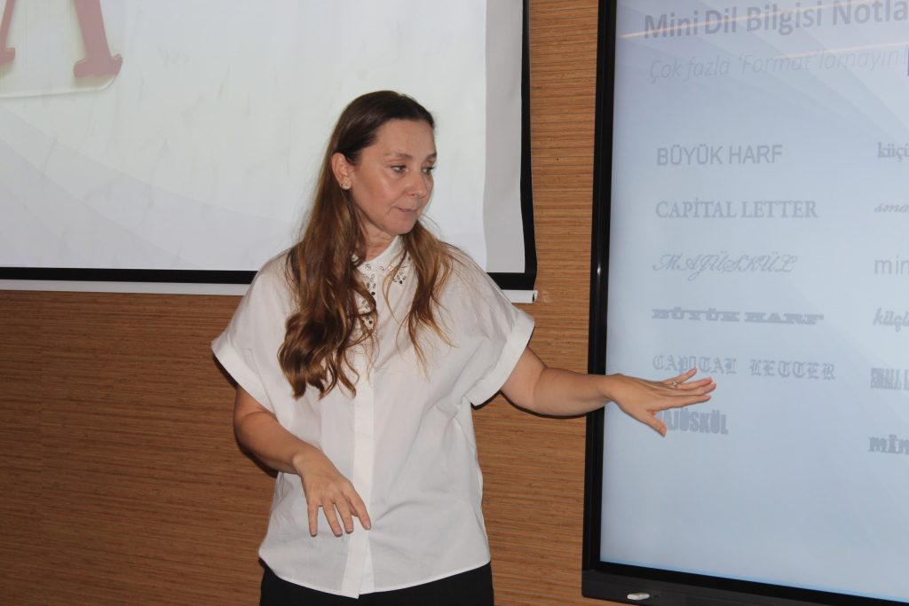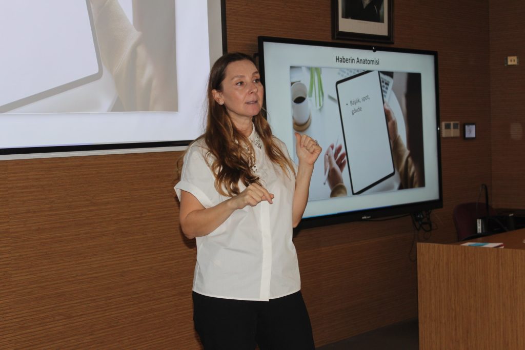 İstanbul, (İÜ Haber Merkezi) – İstanbul Üniversitesi İletişim Fakültesi Gazetecilik Bölüm Başkanı Prof. Dr. Aslı Yapar Gönenç’in yürüttüğü Yazım Teknikleri dersine Stratejik İletişim Danışmanı Gülten Karaca Çoban konuk oldu. Çoban, haber yazımı ve kurumsal yazışma incelikleri hakkında bilgi ve tecrübelerini öğrencilere aktardı.