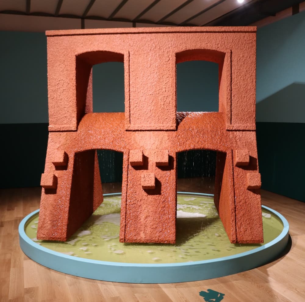 Galeri 77’deki eserler mekân ve belleğin kırılganlığına odaklandı. Sanatçı Ola Hassanain’in “Fısıldayan Baraj” (2024) adlı eseri, Mavi Nil’i El Cezire’ye yönlendiren Sennar Barajı’nın modern mimarisini çağrıştıran heykelimsi bir formda. Yapıtın içine yerleştirilen ses çalışması hem işitsel arınma sağlamakta hem de doğa güçlerine karşı direnç kazandıran bir “korunma duası” fısıldamakta.