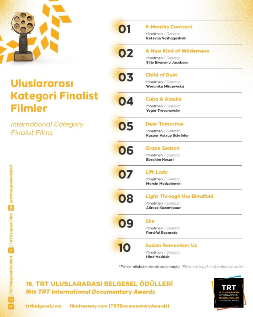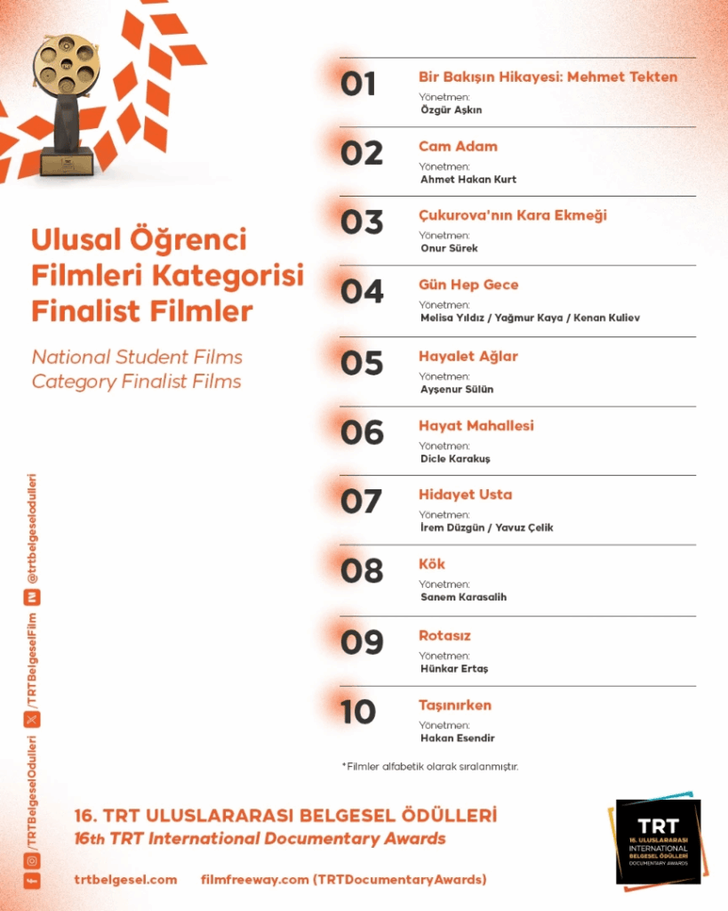 Ulusal Profesyonel Kategori, Uluslararası Kategori, Ulusal Öğrenci Filmleri Kategorisi ve Proje Destek Kategorisi olmak üzere toplam 4 kategoriden 40 finalist en iyi belgesel ödülü için yarışacak. Ulusal Öğrenci Filmleri Kategorisi’nde İstanbul Üniversitesi İletişim Fakültesi Radyo, Televizyon ve Sinema Bölümü yüksek lisans öğrencisi Ayşenur Sülün’ün Hayalet Ağlar isimli belgesel filmi de yarışıyor.