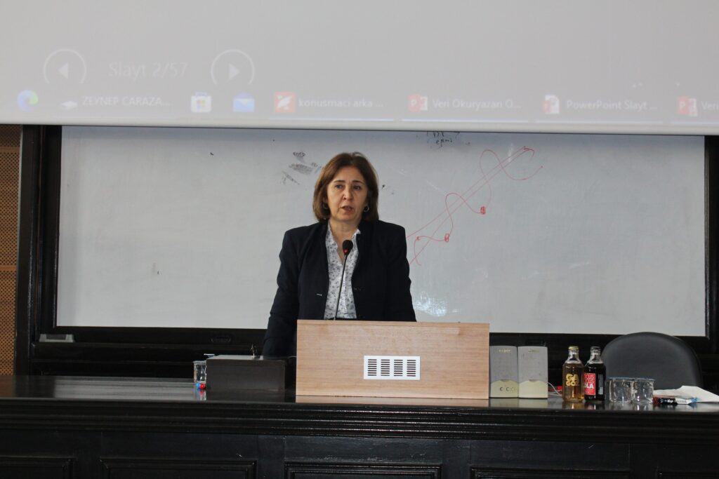 Veri etiği hakkında konuşma gerçekleştiren Türkiye Cumhuriyet Merkez Bankası Veri Analitiği ve Görselleştirme Müdürü Aycan Özek, konuşmasının başında eğitiminden ve çalışma hayatından söz etti.