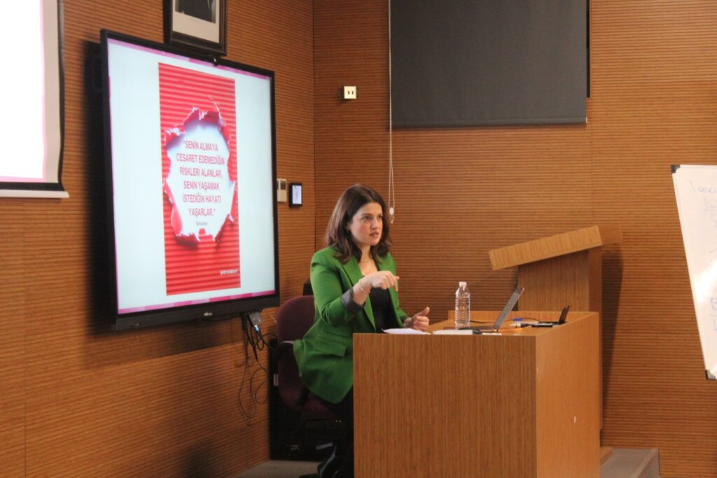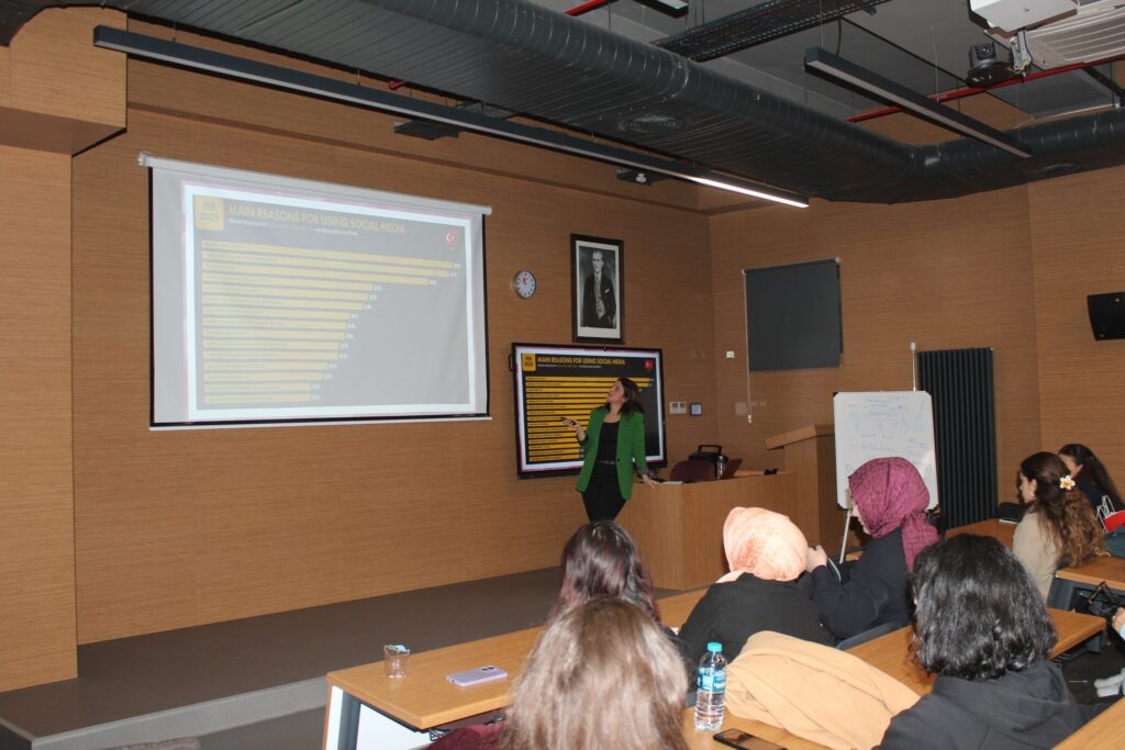 Sevcan Eray, öğrencilere sosyal medya okuryazarlığı ve kişisel gelişime dair bilgilerini aktardı.