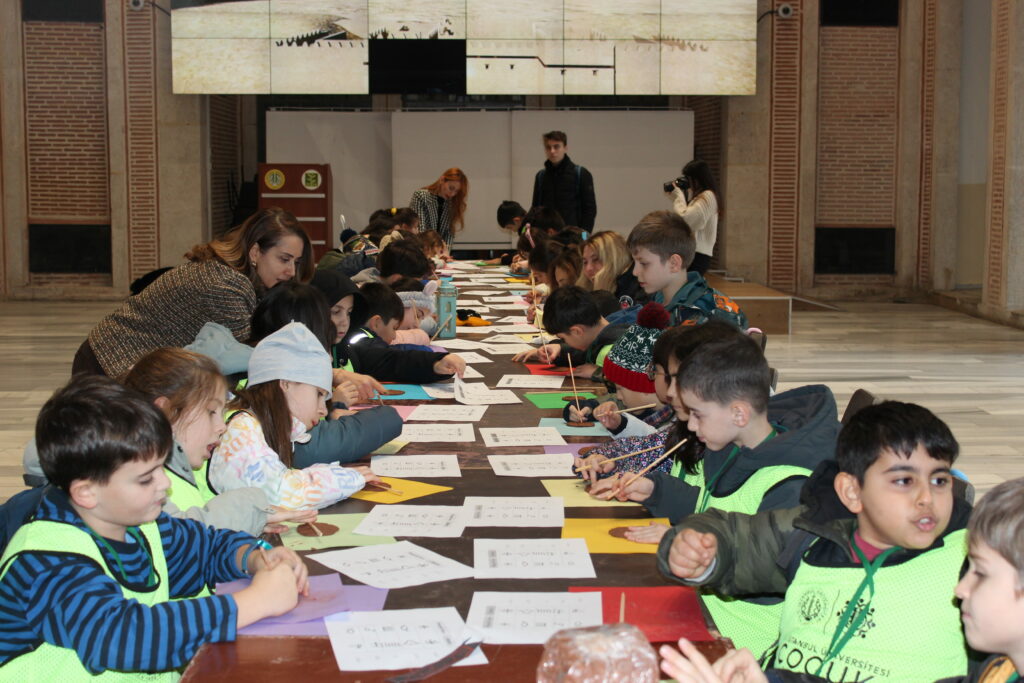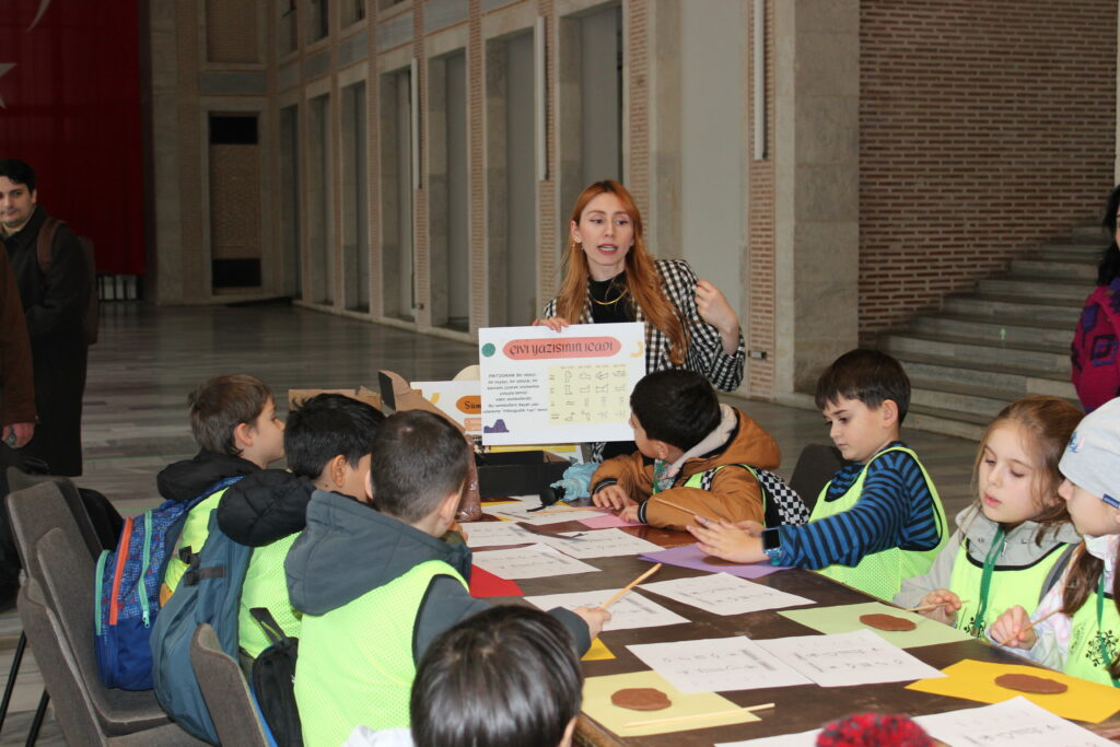 Daha sonra Prehistorya Laboratuvarı’na geçildi. Arş. Gör. Yasin Gökhan Çakan, öğrencilere arkeolojik kazılarda bulunan eserler hakkında bilgi verdi ve öğrencilerin merak ettiği soruları yanıtladı. Doç. Dr. Aliye Erol eşliğinde Şeref Holü’nde çivi yazısı etkinliği gerçekleştirildi. Öğr. Gör. Burcu Özer, çivi yazısının tarihi hakkında sunum yaptı ve öğrencilere uygulamalı olarak yazımını öğretti.