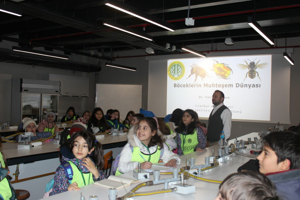 Programın üçüncü gününde çocuklar, akademik yolculuklarına Fen Fakültesi ile başladı. Fakültede yer alan laboratuvarları gezen öğrenciler, burada kullanılan araç ve gereçlerin isimlerini ve hangi amaçlarla kullanıldığını yakından tanıma fırsatı buldu. Program kapsamında Dr. Öğr. Üyesi Fatih Dikmen tarafından gerçekleştirilen “Böceklerin Muhteşem Dünyası” başlıklı sunum büyük ilgi gördü. Sunumda; böceklerin anatomik yapıları, tür çeşitliliği, doğadaki rolleri, yaşam alanları ve ekosistem içindeki önemleri çocukların anlayabileceği bir dille aktarıldı. Etkileşimli anlatım sayesinde öğrenciler, doğaya ve canlılara dair farkındalık kazandı.