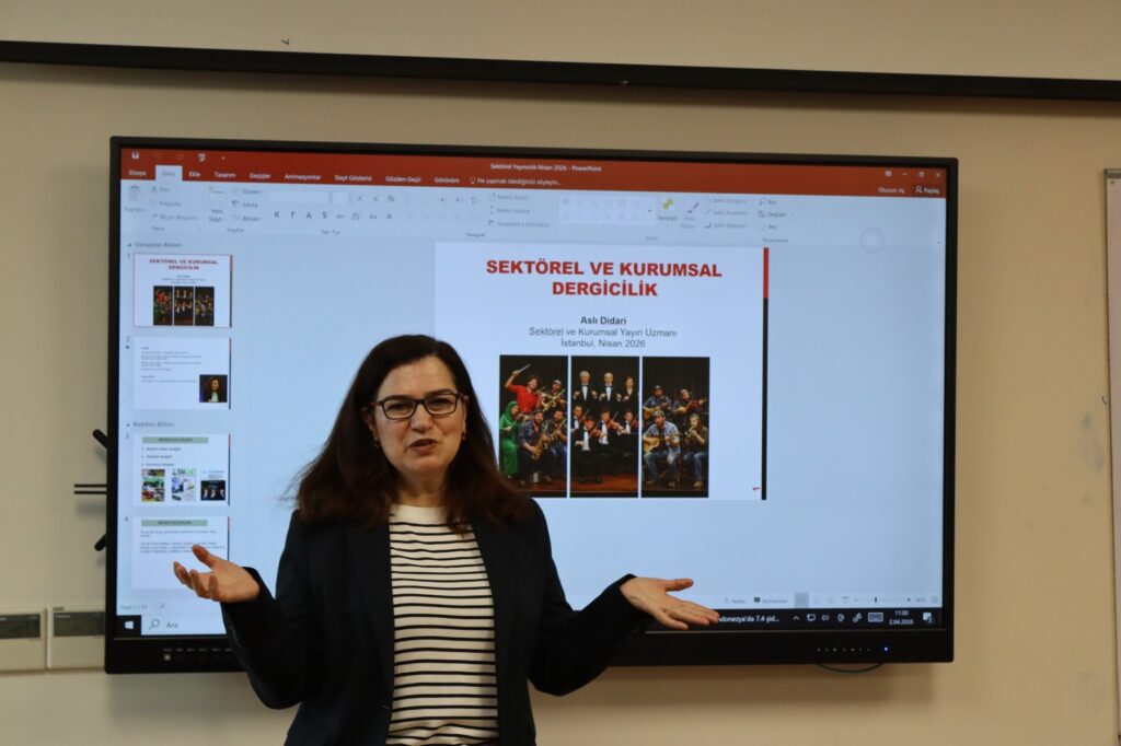 İstanbul Üniversitesi (İÜ) İletişim Fakültesi Gazetecilik Bölüm Başkanı Prof. Dr. Aslı Yapar Gönenç tarafından Derslik 2’de yürütülen Dergi Medyası dersine konuk olan Sektörel ve Kurumsal Dergi Uzmanı Aslı Didari ile Yeni Gazete İmtiyaz Sahibi ve Sorumlu Yazı İşleri Müdürü İsmail Polat dergicilik alanında edindikleri deneyimleri öğrencilere aktardı.